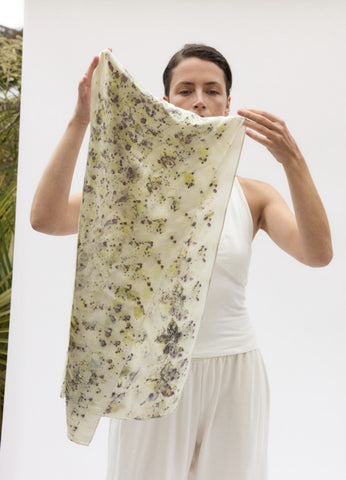 Made in collaboration with Hellenius Botanicals, each piece is truly one-of-a-kind. Hand-dyed, one at a time, in California using leaves and petals foraged from the landscape.